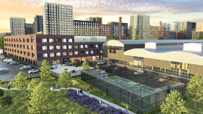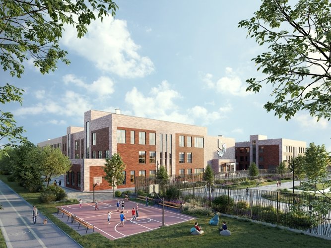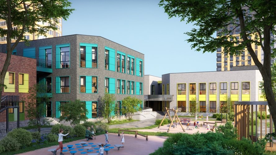 На территории комплекса запроектированы инновационная школа на 1550 учеников и три детских сада на 800 мест. Это означает, что ребёнок растёт и обучается рядом с домом, без утомительных поездок и утренней спешки. Для семьи с детьми это решающее преимущество: забота, образование и безопасность – буквально во дворе.